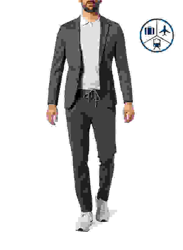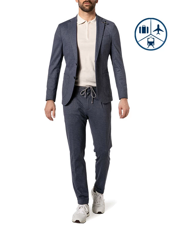 Dieser moderne Anzug ist ein Highlight für Ihren smarten Auftritt. Die hochwertige Verarbeitung mit Ziernähten in Handstich Optik akzentuiert den Zweiteiler. Eine Logo Schlaufe aus Leder am Revers unterstreicht die trendige Optik. Die elastische Jerseyqualität und ein ungefüttertes Sakko machen diesen Anzug zum idealen Reisepartner. Eine Jogpant als Alternative zur klassichen Anzughose bringt das bequeme Material optimal zur Geltung.